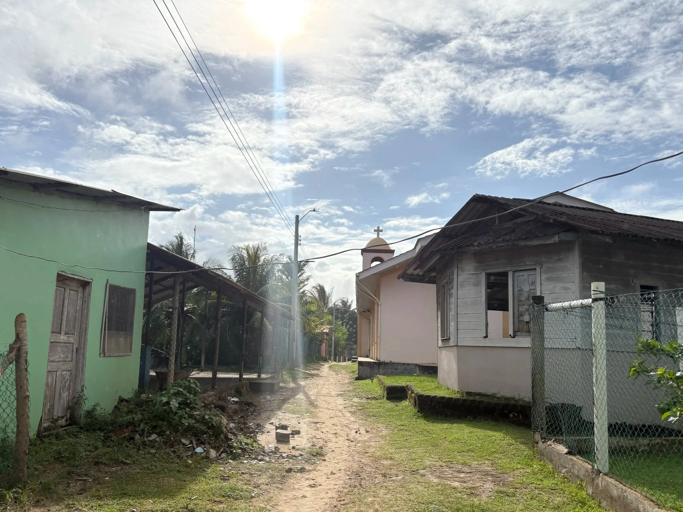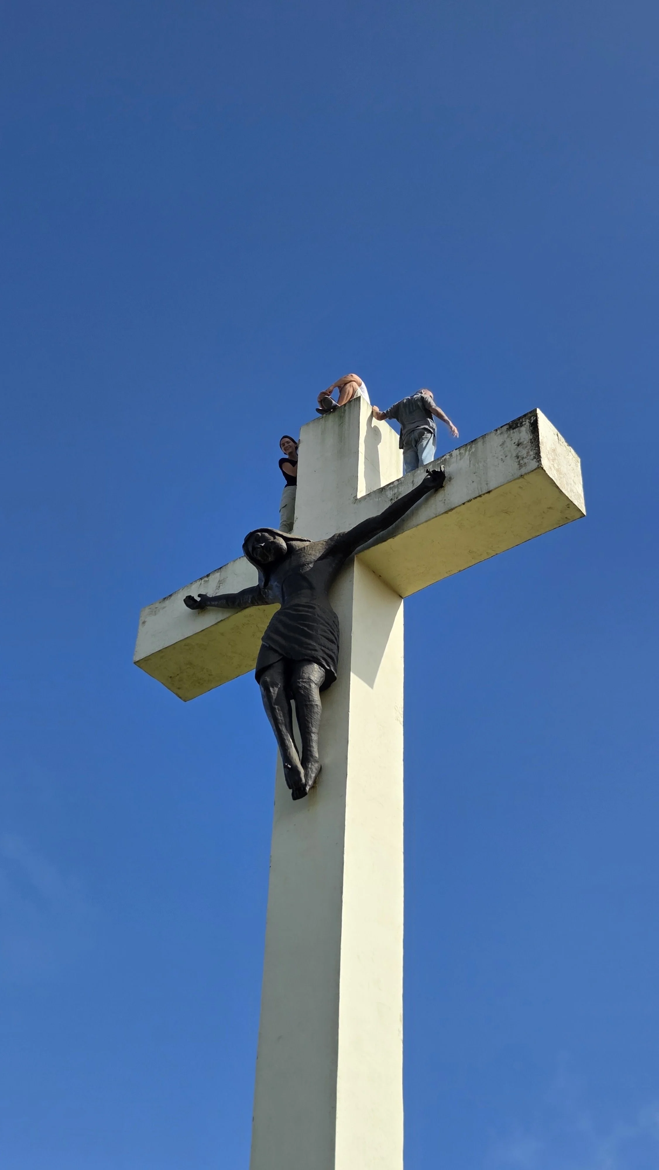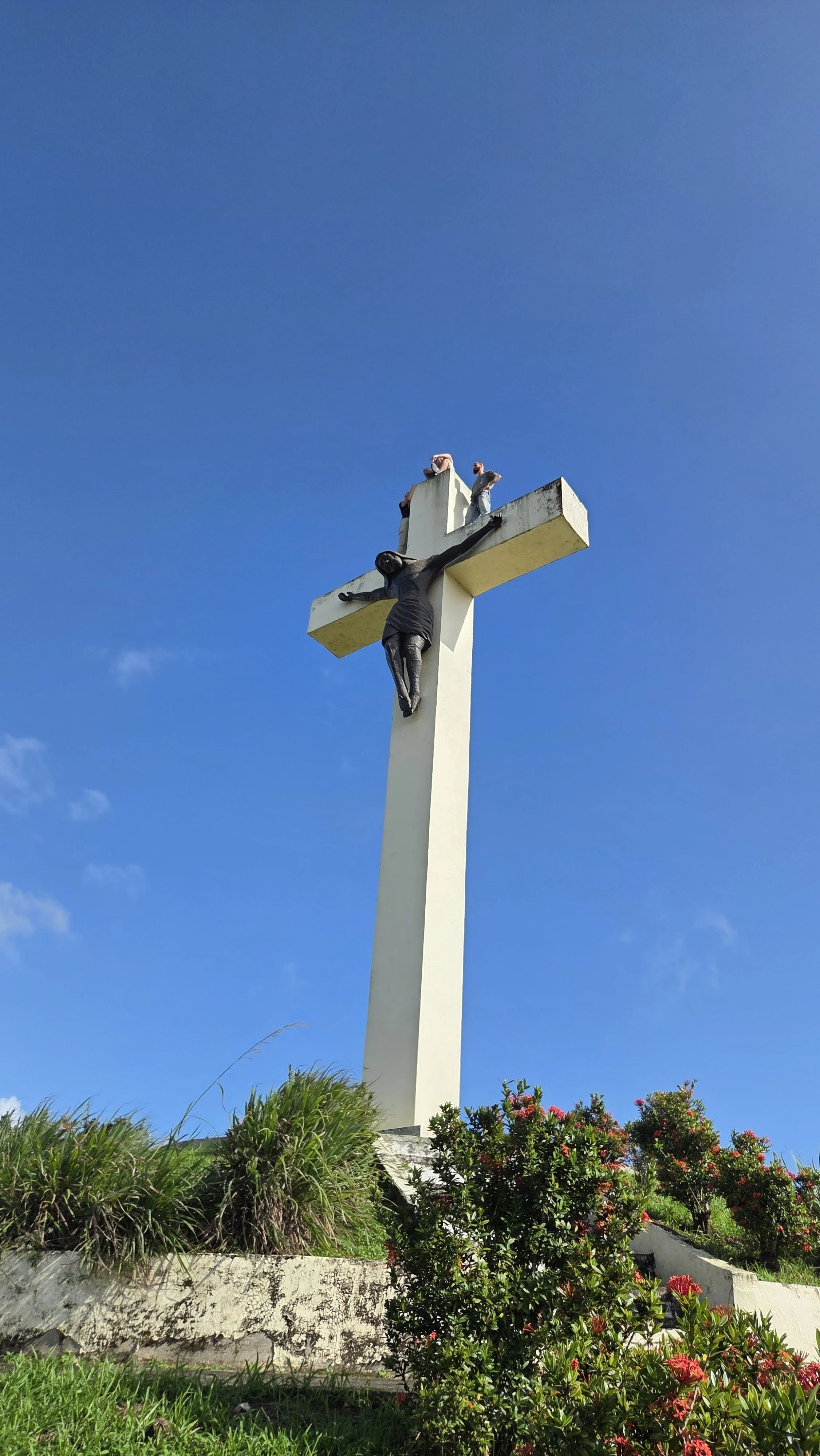 Teddy, Father José, and I taking in the stunning view at the retreat house. In front of the cross lay the beach and behind lagoons and mountians.